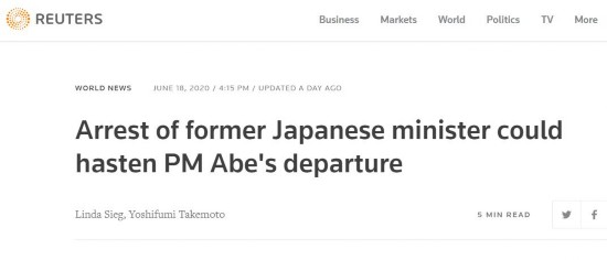 [环球网报道 记者 崔天也] 日本前法务大臣河井克行及其妻子18日因涉嫌拉票贿选被捕后,英国路透社发表评论称,这一事件对日本首相安倍晋三来说,可能将是一场“毁灭性的打击”。