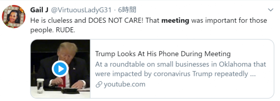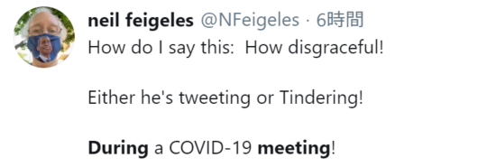 “我该怎么说呢,他太无礼了!!他要么在发推要么在玩交友软件,在一个关于新冠疫情的会议上!”