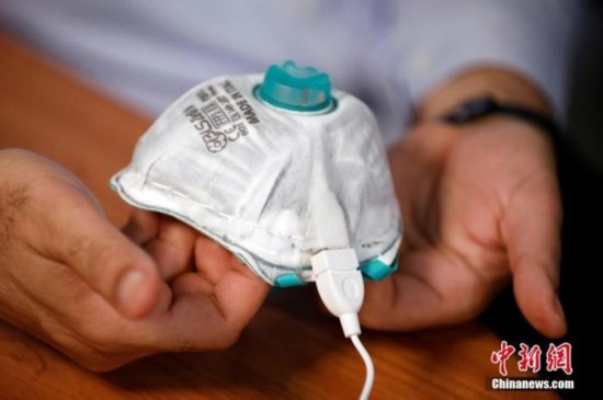 近日,以色列海法,研究小组人员在实验室演示他们发明的一种可重复使用,并自行消毒的口罩。图片来源:人民视觉