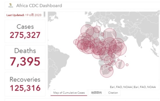 截至非洲东部时间6月19日下午2时,非洲疾控中心数据显示:非洲地区54个国家报告了新冠肺炎确诊病例275327例,死亡7395例,125316人康复。