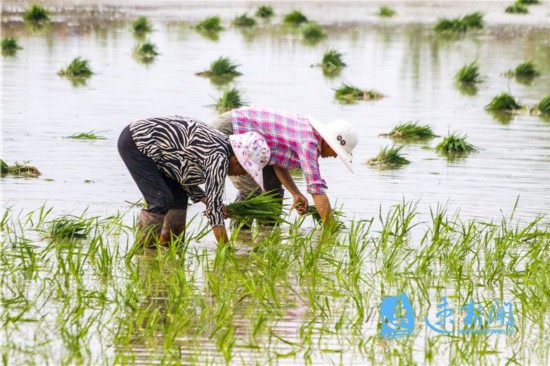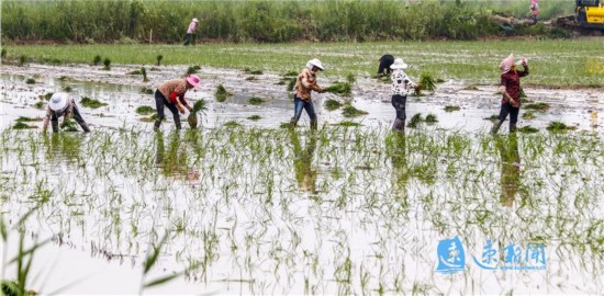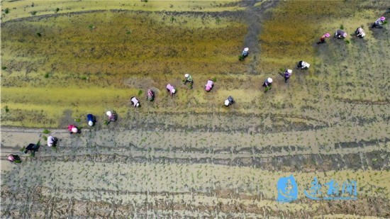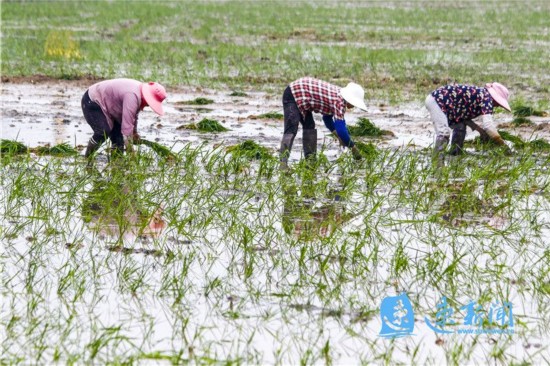 2020年6月19日,泗阳县城厢街道姚圩村村民在田里忙着栽插水稻。时下,正是水稻栽插时节,农民抢抓农时栽插水稻,田间地头一派繁忙景象。