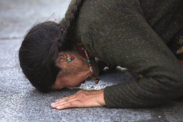 ▲大昭寺前磕长头的藏族阿妈。五体投地,磕等身长头的身姿与声响,是除熙攘的转经人流外,八廓街最为动人的另一种节奏。 (摄影秋天)