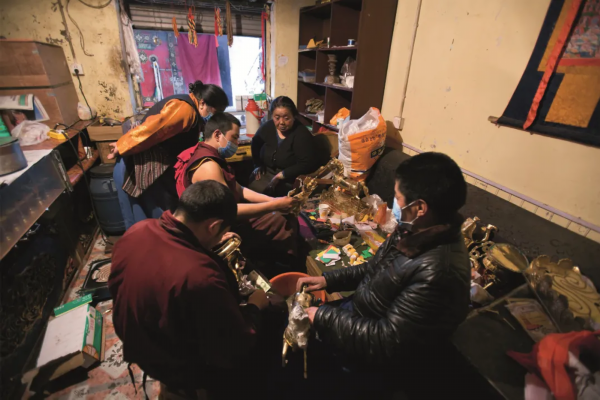 ▲在城南三怙主佛堂西殿帮忙的57岁的次丹卓嘎,正在帮临街的僧人为佛像装藏。佛像在供奉前,都要先进行“装藏”和“开光”加持仪式。 (摄影秋天)