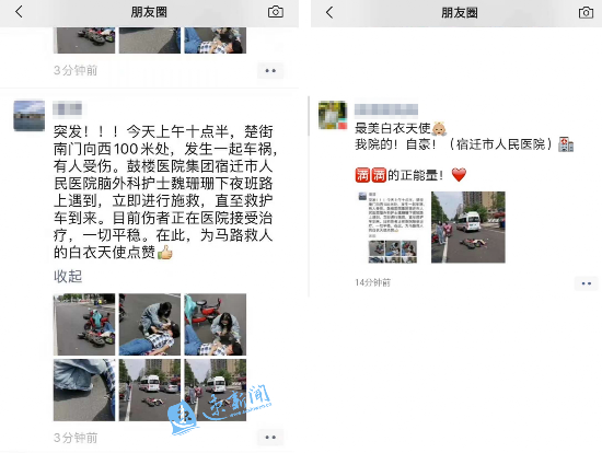 护士救人的瞬间被围观的热心市民拍摄了下来,并发到网上。市民潘女士说:“这名护士跪在伤者面前进行施救,为伤者的救治争取了宝贵时间和机会,为马路救人的白衣天使点赞!”