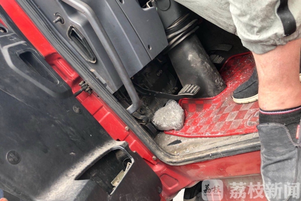 当天中午,张家港市公安局交警锦丰中队接到报警,在兴业路与南中心河路的丁字路口发生一起离奇的交通事故,一名重型货车驾驶人受伤。接警后,民警迅速赶到现场,只见重型货车驾驶人李某捂着胸口趴在方向盘上,表情痛苦不堪,货车挡风玻璃上赫然一个大窟窿。在驾驶室的角落里,民警发现了“肇事者”——一块棱角分明的石块。