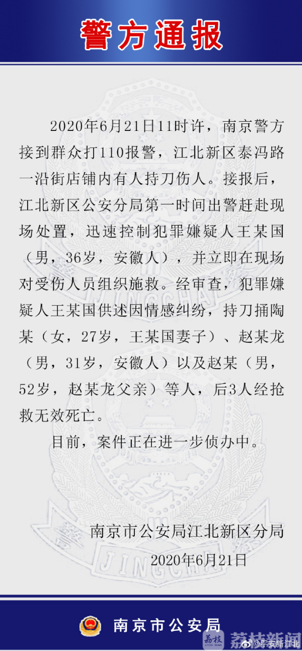 南京市公安局江北新区分局今晚(6月21日)发布通报,6月21日11时许,南京警方接到群众打110报警,江北新区泰冯路沿街店铺内有人持刀伤人。