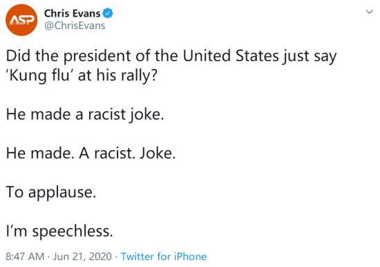 他写道:“美国总统刚才在他的(竞选)集会上是不是说了‘功夫流感’?他开了一个种族主义玩笑。他的确开了(一个种族主义玩笑)。一个种族主义者。开玩笑。(这番话还赢得)一片掌声,我感到无语。”