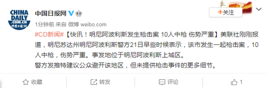 美联社刚刚报道,明尼苏达州明尼阿波利斯警方21日早些时候表示,该市发生一起枪击案,10人中枪,伤势严重。事发地位于明尼阿波利斯上城区。