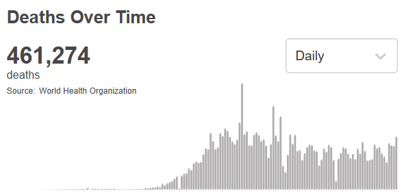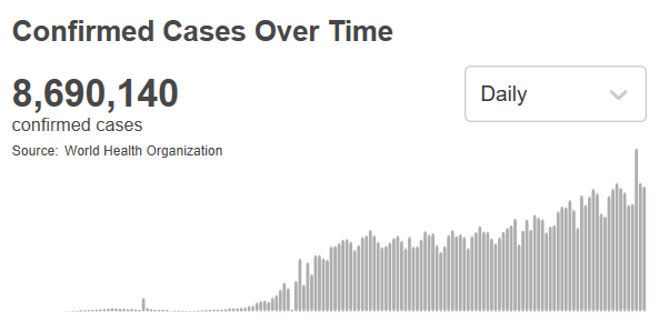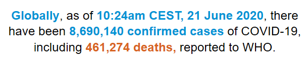 根据世卫组织最新实时统计数据,截至欧洲中部夏令时间6月21日10时24分(北京时间6月21日16时24分),全球累计新冠肺炎确诊病例8690140例,累计死亡病例461274例。