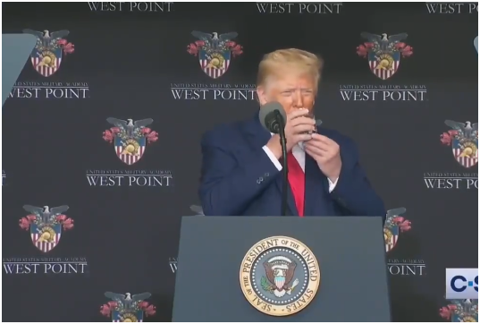 非裔美国人弗洛伊德遭白人警察暴力执法致死,加上亚特兰大黑人男子布鲁克斯被白人警察击毙,引爆美国多场抗议示威,给特朗普13日的西点军校毕业生致词演讲蒙上了阴影。在西点军校演讲中,特朗普喝水时被媒体拍到右手拿起水杯,却无法顺利让杯缘就口,他后来举起左手辅助,才顺利喝到水。另外,演讲结束、离开现场时,特朗普被拍到步履缓慢、小心翼翼地走下斜坡阶梯。