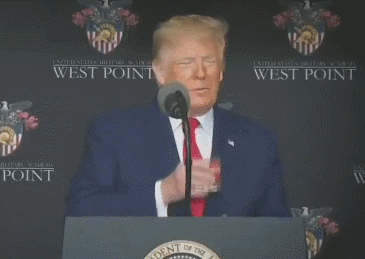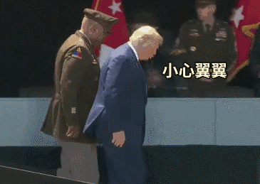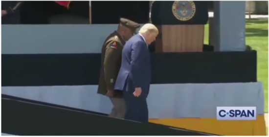 “你们明白的——我刚敬礼敬了将近600次(向大约600名西点军校学员敬礼),我刚刚发表了一个重要讲话,我坐在那儿听其他人演讲,我正在被(太阳)烤,我正被像个蛋糕一样烤着。”特朗普说,“我说,‘将军,我不可能从坡道上下来不摔着屁股,将军。’”