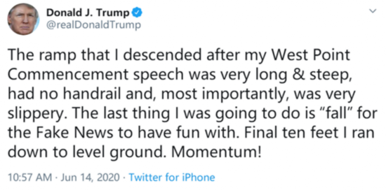 特朗普告诉在塔尔萨市聚集的支持者们说,他当时从斜坡上走下来比较费劲的部分原因是因为他穿着皮底鞋。他还表示坡道很滑,“就像溜冰场一样”,也没有扶手让他抓住。