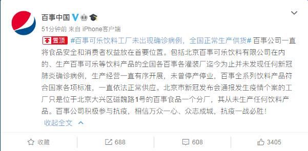 百事中国称,百事公司一直将食品安全和消费者权益放在首要位置。包括北京百事可乐饮料有限公司在内的、生产百事可乐等饮料产品的全国各百事各灌装厂迄今为止并未发现任何新冠肺炎确诊病例,生产经营一直有序开展,未曾停产停业,百事全系列饮料产品符合国家各项标准,一直依法正常供应。北京市新冠发布会通报发生疫情个案的工厂只是位于北京大兴区磁魏路1号的百事食品一个分厂,其从未生产任何饮料产品。