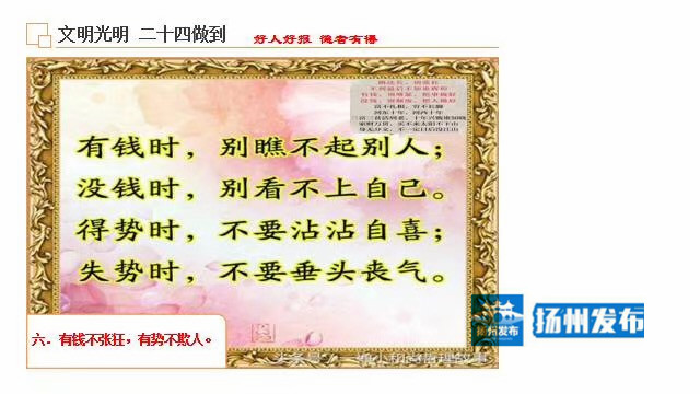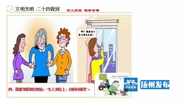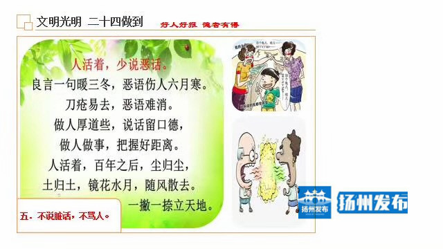 文明乡风是乡村振兴的重要内容和有力保障。记者今天上午在仪征市新集镇光明村采访发现,光明村对先前的“村规民约”进行修改,新制定了“文明光明二十四做到”,“生人到庄上,目的问清爽”“有钱不张狂,有势不欺人”……每一句读起来朗朗上口,“文明光明二十四做到”改变群众教育中的一般性说教方式,做到让人看得懂、读得通、乐于看,浓缩了行为、道德、家庭、诚信、集体等方面,每一条都是村民很好理解的“大白话”。接地气的“文明光明 二十四做到”,就如同一张名片,言简意赅,一目了然。