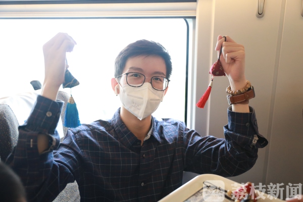 最精彩的要数知识竞答环节。竞答内容涉及端午、香囊、彩蛋等传统文化和高铁知识,更有高铁乘务工作者亲手缝制的香囊作奖品。当旅客纷纷举手表示吃过红鸡蛋时,大家才知道,彩蛋在中国已经有一两千年的历史了。 说到“彩蛋”的寓意,旅客们给出了不同的答案:有说是电影结尾给大家安排的福利片段,有说就是带画的工艺品。一名青年旅客分享道,小时候每到端午,乡下的外公外婆就给他脖子上挂上“长命寿蛋”祈福保佑平安,所以“彩蛋”也是平安蛋。青年旅客挑了乘务人员赠送的鸭蛋网兜和卡通彩蛋留念。
