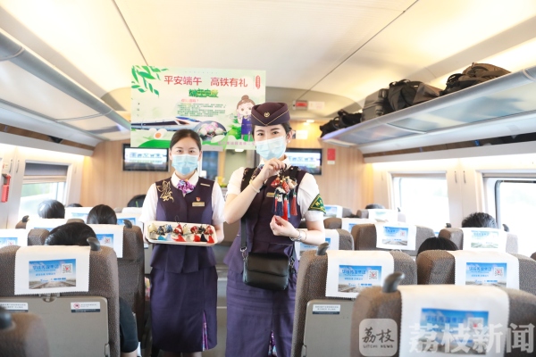 6月也是安全生产月,高铁安全更是重中之重。乘务员向旅客宣传乘车安全知识,竞答时,旅客们也纷纷给出了答案:要戴口罩、不能吸烟、不能趴小桌板睡觉、不能霸座等等,让乘务员们十分欣慰。一枚枚乘务工作者亲手缝制的香囊送到旅客手中,受到了一致称赞。