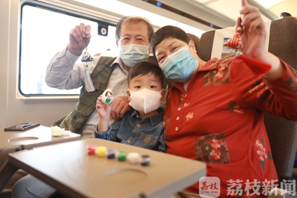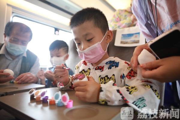 6月19日,由南京南高铁站开出的G7299次列车上,蛋壳彩绘、祈福香囊送祝福、高铁安全知识宣传和竞答活动有条不紊地进行着,浓郁的传统文化和知识碰撞让大家回味无穷。