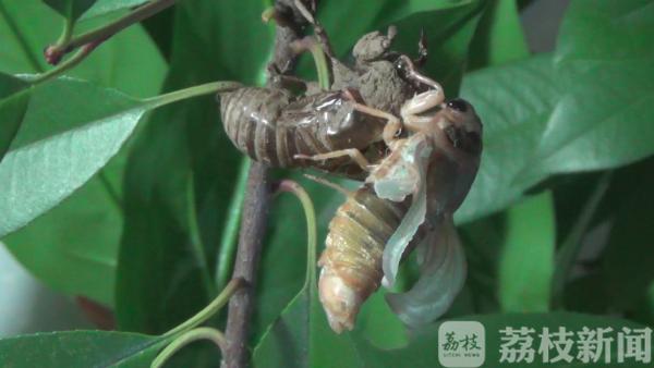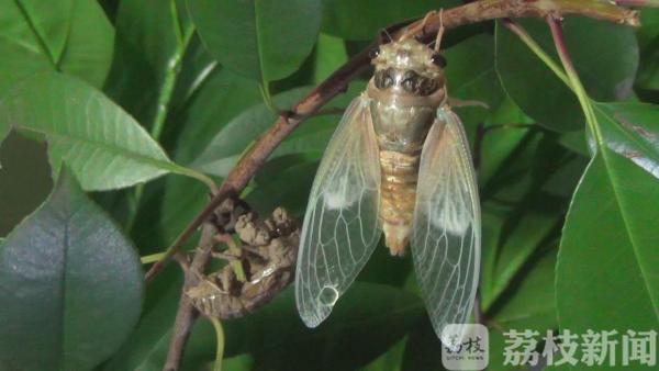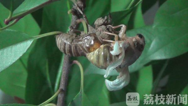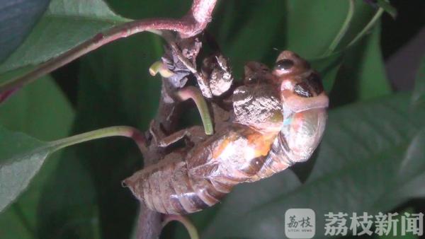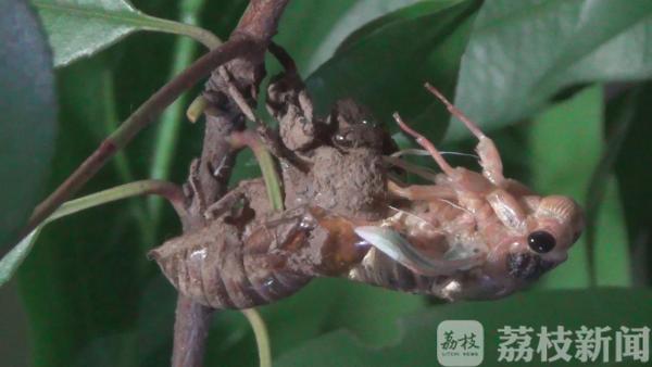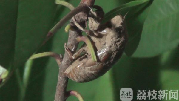 近日,连续暴雨过后,正是蝉羽化成虫的时期,大量蝉的幼虫从地里钻出爬上树,破壳而出。6月20日凌晨0点,在南京鼓楼区小桃园里,“金蝉脱壳”的全过程也被有心市民拍摄下来了。一只蝉爬在一根树枝上缓缓地蠕动着身体,随后,便在树枝上不动弹了。