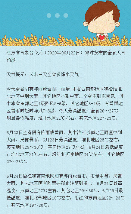 今天(6月22日)江苏全省阴有阵雨或雷雨,雨量:本省西南部地区和沿淮淮北地区中到大雨,其它地区小到中雨,全省东到东南风,其中本省东部地区4级阵风5-6级,其它地区3-4级,有雷雨地区雷雨时短时阵风7-8级,今天最高温度:全省26~27℃,明晨最低温度:淮北地区21℃左右,其它地区22~23℃。