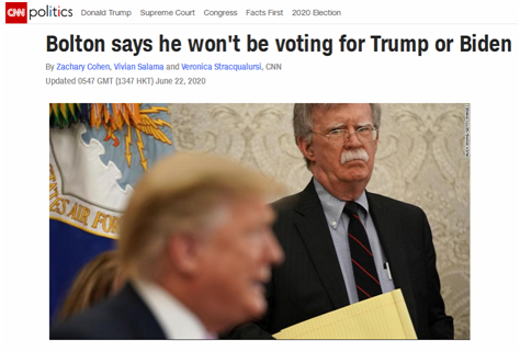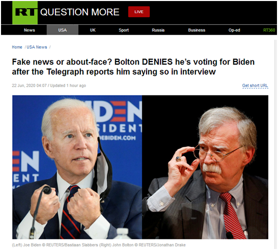 然而,美国有线电视新闻网(CNN)和今日俄罗斯(RT)都注意到,报道里并没有引用博尔顿说“打算投票给拜登”的原话。