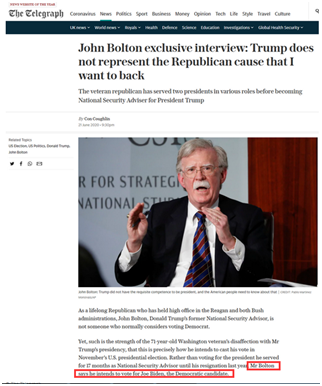 《每日电讯报》报道说:“博尔顿说,他打算投票给民主党候选人乔 拜登。”↓