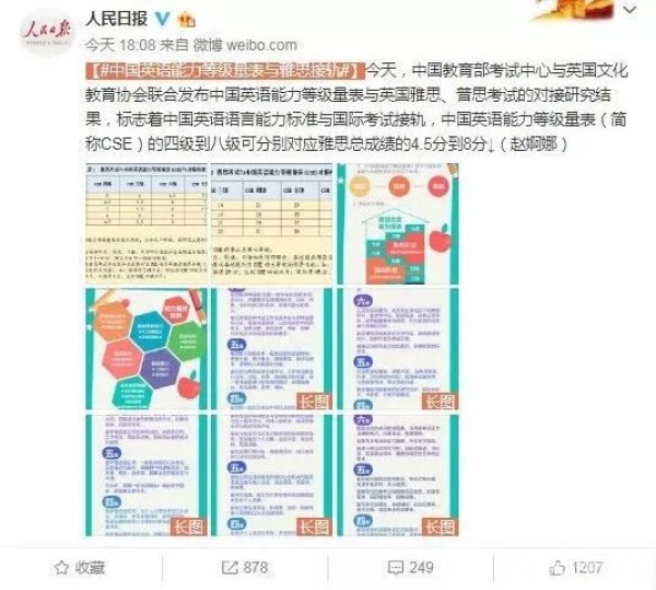 荔枝新闻讯 去年初,教育部考试中心与英国文化教育协会联合发布了中国英语能力等级量表(简称CSE)与雅思考试的对接研究结果,雅思4.5分相当于CSE4级;雅思5.5分相当于CSE5级;雅思6分相当于CSE6级;雅思7分相当于CSE7级;雅思8分相当于CSE8级。