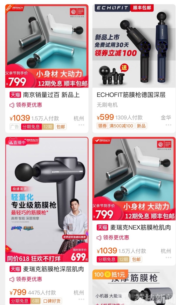 记者注意到,让筋膜枪迅速红出圈的,是大量涌入的国内厂商。“运动恢复工具”成了“按摩神器”“撸铁族”能用,广场舞大妈大伯也能用。这一定位的改变,应用场景随之无限放大。