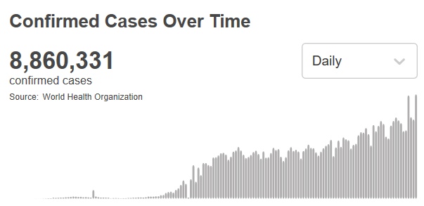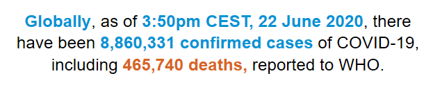 根据世卫组织最新实时统计数据,截至欧洲中部夏令时间6月22日15时50分(北京时间6月22日21时50分),全球确诊新冠肺炎8860331例,死亡465740例。(总台记者 朱赫)