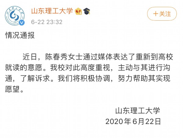 荔枝新闻消息,6月22日晚,山东理工大学官方微博发布消息表示,学校将积极协调,努力帮助被顶替者陈春秀实现读书愿望。详情》