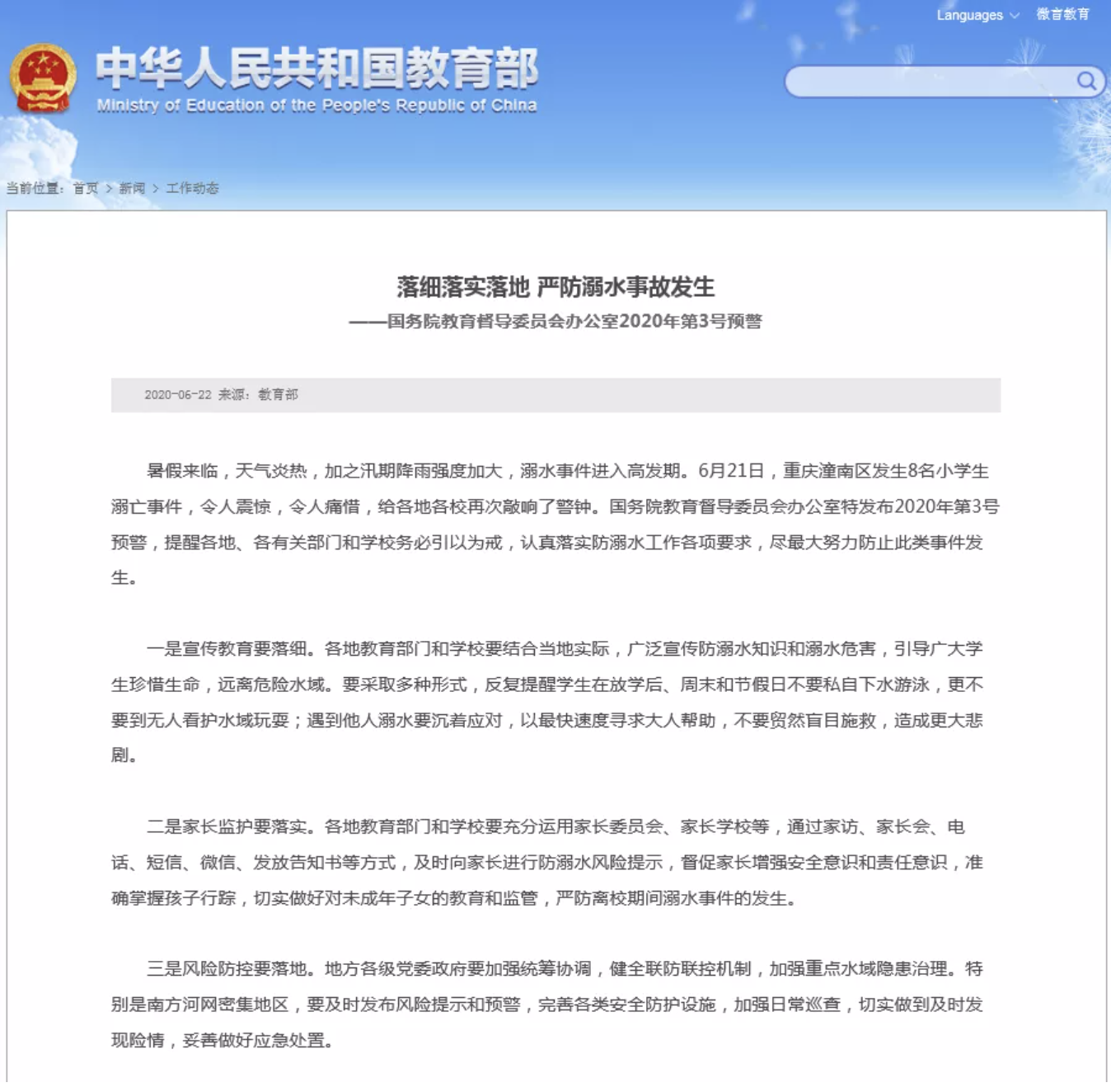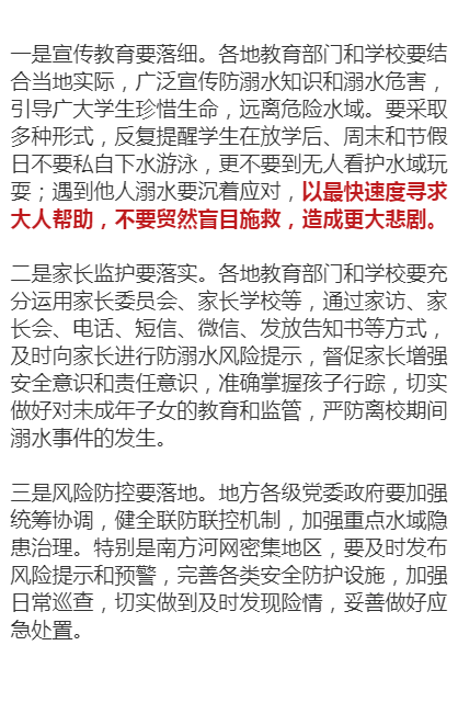 暑假来临,天气炎热,加之汛期降雨强度加大,溺水事件进入高发期。6月21日,重庆潼南区发生8名小学生溺亡事件,令人震惊,令人痛惜,给各地各校再次敲响了警钟。国务院教育督导委员会办公室特发布2020年第3号预警,提醒各地、各有关部门和学校务必引以为戒,认真落实防溺水工作各项要求,尽最大努力防止此类事件发生。