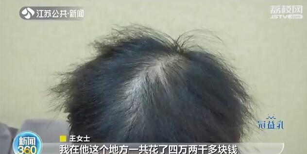 王女士给记者看她现在的头发:“前面很秃,本来后面还有一些头发,现在取下来后后面也没有头发了。我在他这个地方一共花了4万两千多块钱。”