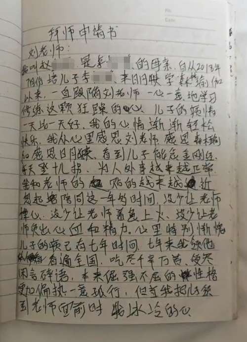赵先生出示了一封孩子母亲写给康养中心刘老师的一封“拜师申请书”,赵钥在“拜师申请书”中表示,李沐已患病七年,曾“看遍全国”未果,于2018年7月进入康养中心学习森林瑜伽,“只用了一年多的时间就发生了奇迹”。关于孩子究竟所患何病,赵先生并未细谈,据新京报报道,李沐因对所考高校不满意,一直情绪不稳定,毕业后来到涉事中心治疗。