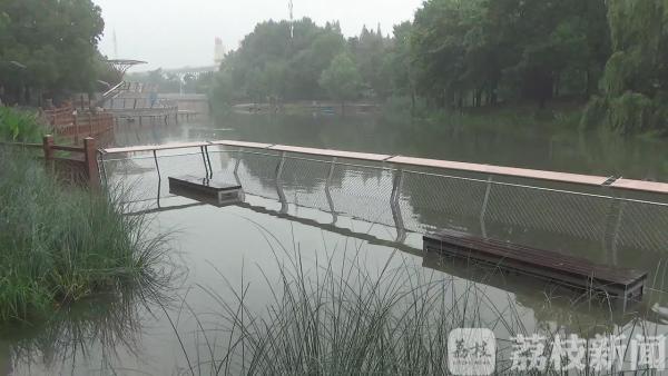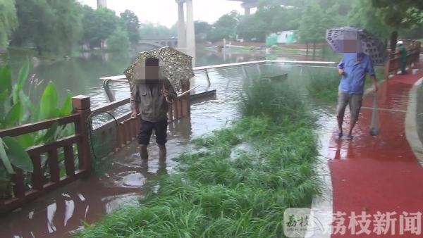 连续几天的雨季,让南京长江水位上涨,江水倒灌金川河,亲水步道被淹,但是这并未挡住一些“冒险者”的“热情”。