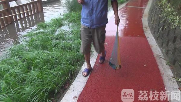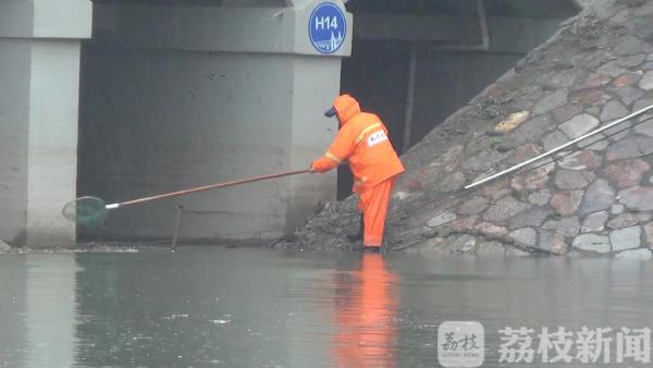 今天(6月23日)上午,河道清淤工人正在冒雨清理水上漂浮物,一些市民用网捞鱼。