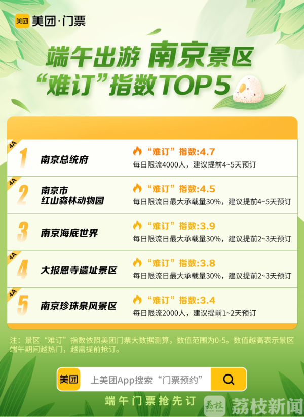 据介绍,难订指数是美团门票大数据分析团队基于端午景区限流要求以及历来节假日游客预订情况形成的测算模型,数值范围设定为0-5,数值越高表示景区端午期间越热门,越需要提前抢订预约。