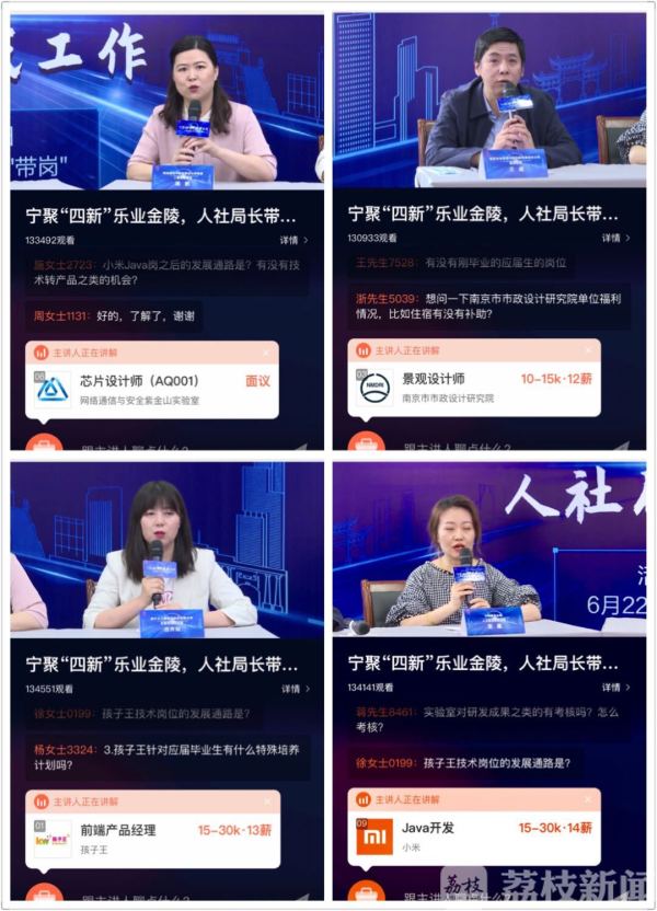 6月22日下午,南京市人社局举办了“宁聚‘四新’乐业金陵 人社局长带你找工作”活动,尝试线上直播"带岗",政府部门"一把手"带着企业人事"一把手"上阵,现场推介工作岗位,短短1小时就吸引了13.5万人在线参与,前半小时现场投递简历近4000份 。