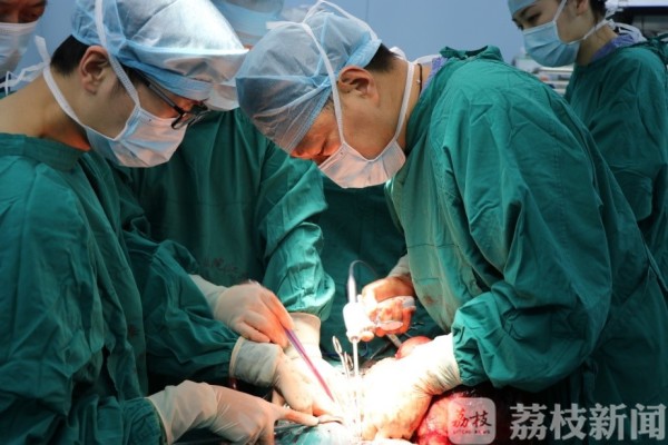 然而,尹女士的手术风险也是巨大的。鼓楼医院江北国际医院普外科病区管文贤主任团队对尹女士的病情进行了审慎的分析,认为术中发生死亡的风险异常高:第一,患者有多次腹部手术史,肿瘤巨大,充满腹腔,无从下刀;第二,肿瘤血供丰富,术中分离肿瘤时随时可能大出血;第三,患者84岁高龄,肿瘤摘除后回心血量会迅速增加,从而导致心衰、心梗等风险;第四,围手术期液体管理难度大,如履薄冰;第五,患者是熊猫血,因疫情期间,整个南京市血液中心当时仅能提供5个单位的同型血,稍有不慎,用血将面临巨大困难。经过反复沟通,患者及家属表示完全能够理解也愿意承担手术风险,与其提心吊胆地苟活,不如“赌上一赌”。