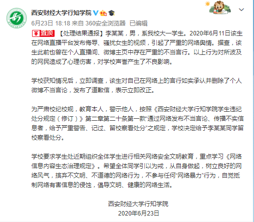 李某某,男,系我校大一学生。2020年6月11日该生在网络直播平台发布侮辱、骚扰女生的视频,引起了严重的网络舆情。据查,该生此前也曾在个人直播间、微博主页中存在严重的不当言行。以上行为对所波及的网民造成了心理伤害,对学校声誉产生了不良影响。