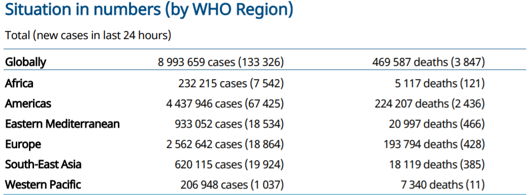 当地时间6月23日,世卫组织发布最新一期新冠肺炎每日疫情报告,全球新增新冠肺炎确诊病例133326例,新增死亡3847例。疫情最为严重的美洲区域确诊病例累计达4437946例(新增67425例),死亡224207例(新增2436例)。(总台记者 朱赫)