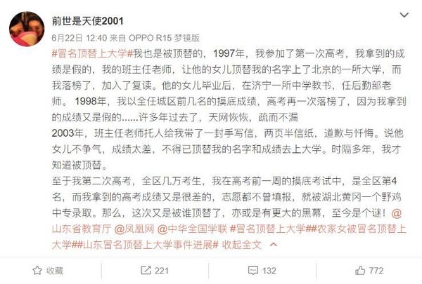 苟女士称,1997年她参加了第一次高考,但拿到的成绩是假的,班主任老师让他的女儿顶替自己的名字上了北京的一所大学,自己落榜了,加入了复读。班主任的女儿毕业后,在济宁一所中学教书,任后勤部老师。 1998年,自己高考再一次落榜了,在志愿都不曾填报的情况下,就被湖北黄冈一个中专录取。她在22年后选择实名举报,“只求一个答案”。