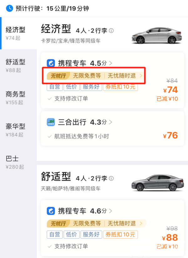 记者在携程APP首页的“专车租车”入口查询,不少接送机产品都打上了“无忧行”的标签。根据政策,在选择携程自营接送机服务时,无论航班是否准点到达,司机都将在航班降落后,按照旅客预约的要求免费等待,而如果旅客的用车需求发生变化,在用车之前也都能够免费取消。