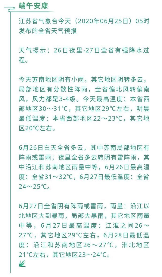今天苏南地区阴有小雨,其它地区阴转多云,局部地区有分散性阵雨,全省偏北风转偏南风,风力都是3-4级。今天最高温度:本省西部地区30~31℃,其它地区29℃左右,明晨最低温度:本省西部地区22~23℃,其它地区20℃左右。
