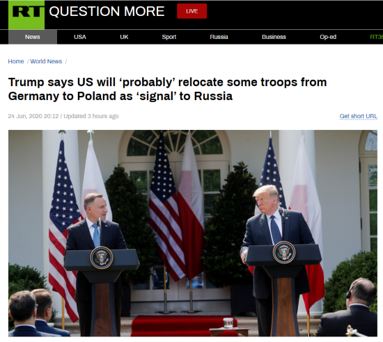 果然,波兰可能要成为驻欧美军的前沿部署重点。据“今日俄罗斯”(RT)24日报道,美国总统特朗普当天表示,他将从德国撤出部分美军并将其重新部署至波兰等地。RT在标题上直接写道,这是在向俄罗斯发出“信号”。美国全国公共广播电台(NPR)表示,这是对特朗普长期以来抱怨德国没有履行北约国防开支义务的回应。