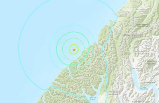 新西兰南岛米尔福德峡湾地区发生5.5级地震。(图片来源:美国地质勘探局网站截图)
