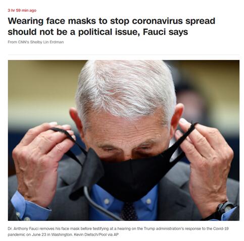 报道称,在24日的一次采访中,福奇被问及在全美10多个州新冠病例持续增加的情况下,戴口罩的政治化问题。