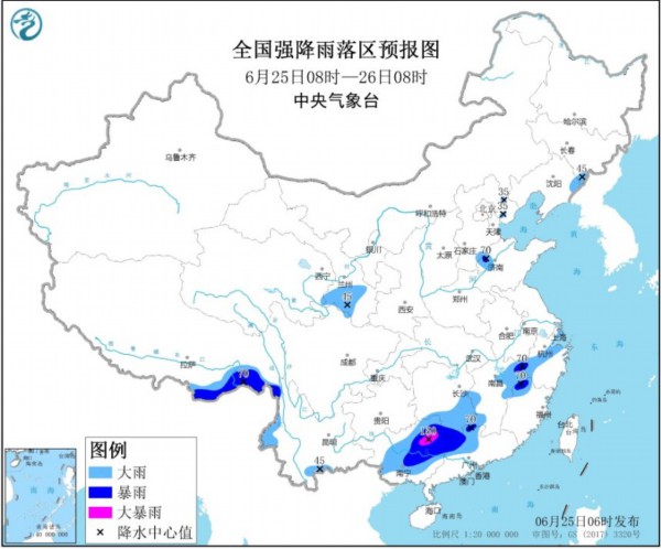 人民网北京6月25日电 中央气象台6月25日06时发布暴雨蓝色预警:预计,6月25日08时至26日08时,广西中东部、湖南南部、广东北部、江西西部和东北部、福建西北部、浙江中西部、上海等地的部分地区有大到暴雨,其中,广西东北部局地有大暴雨(100~150毫米)。另外,甘肃南部、河北东部、山东西北部、辽宁东部、云南西部和南部、西藏东南部等地的部分地区有大雨,局地暴雨。上述部分地区伴有短时强降水(最大小时降雨量30~50毫米,局地可超过70毫米),局地有雷暴大风等强对流天气。