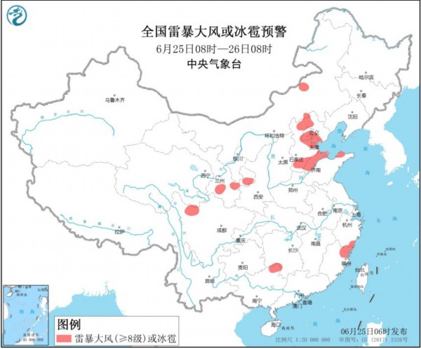 中央气象台还在同一时间继续发布强对流天气蓝色预警:预计6月25日08时至26日08时,甘肃南部、内蒙古中东部、河北、北京、天津、山东北部等地的部分地区将有8-10级雷暴大风或冰雹天气,其中甘肃南部、陕西中部、河北、北京中南部、天津、山东北部等地的部分地区伴有小时雨量20-40毫米的短时强降水,局地可达50毫米。另外,广西中部、广东北部、湖南东南部、江西中部、浙江东南部、福建北部和西南部、云南中东部等地的部分地区有短时强降水天气,预计小时雨量30-50毫米,局地可达70毫米以上;其中浙江南部、福建东北部、广西北部等地局地伴有8-9级雷暴大风。