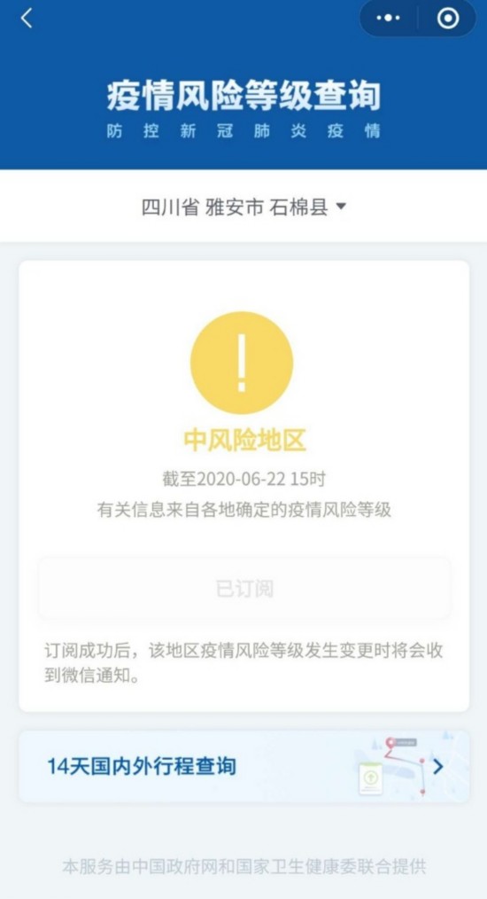 6月24日晚,四川省疾病预防控制中心微信公众号发布消息称,6月15日,四川省雅安市石棉县确诊1例新冠肺炎省外输入病例。根据国家新冠肺炎疫情风险等级划分标准,经专家研判,6月22日将石棉县调整为中风险地区。