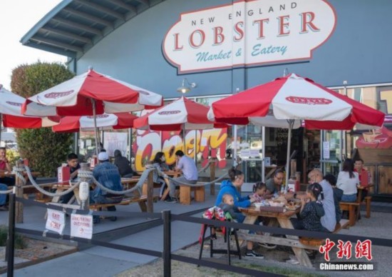 当地时间6月19日,美国加利福尼亚州圣马特奥县居民在一家餐厅就餐。目前,加州重启经济进入第三阶段,只要所在县允许,电影院、餐厅以及大型购物中心等高风险设施可以重新营业。 中新社记者 刘关关 摄