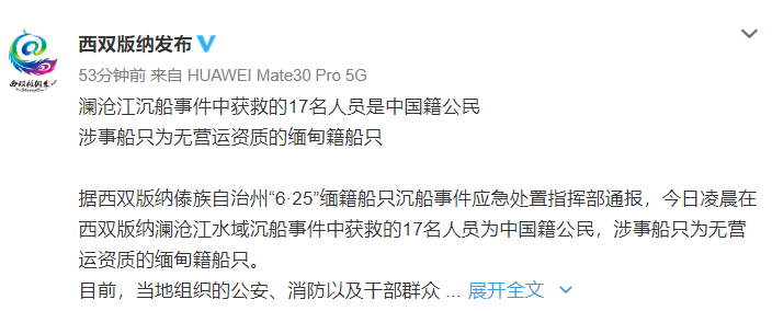 据西双版纳傣族自治州“6·25”缅籍船只沉船事件应急处置指挥部通报,今日凌晨在西双版纳澜沧江水域沉船事件中获救的17名人员均为中国籍公民,涉事船只为无营运资质的缅甸籍船只。